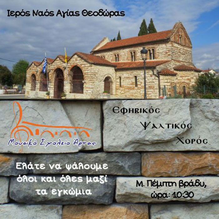 Την Μ. Πέμπτη, 17 του Απρίλη του 2025, στις 10:30 το βράδυ σας περιμένουμε στον Ιερό Ναό της Αγίας Θεοδώρας, όπου οι μαθητές και οι μαθήτριες του Εφηβικού Ψαλτικού Χορού μαζί με τους/τις απόφοιτους/ες του Μουσικού Σχολείου Άρτας, θα ψάλουν μετά το τέλος της ακολουθίας τις τρεις στάσεις των Εγκωμίων του Επιτάφιου Θρήνου.