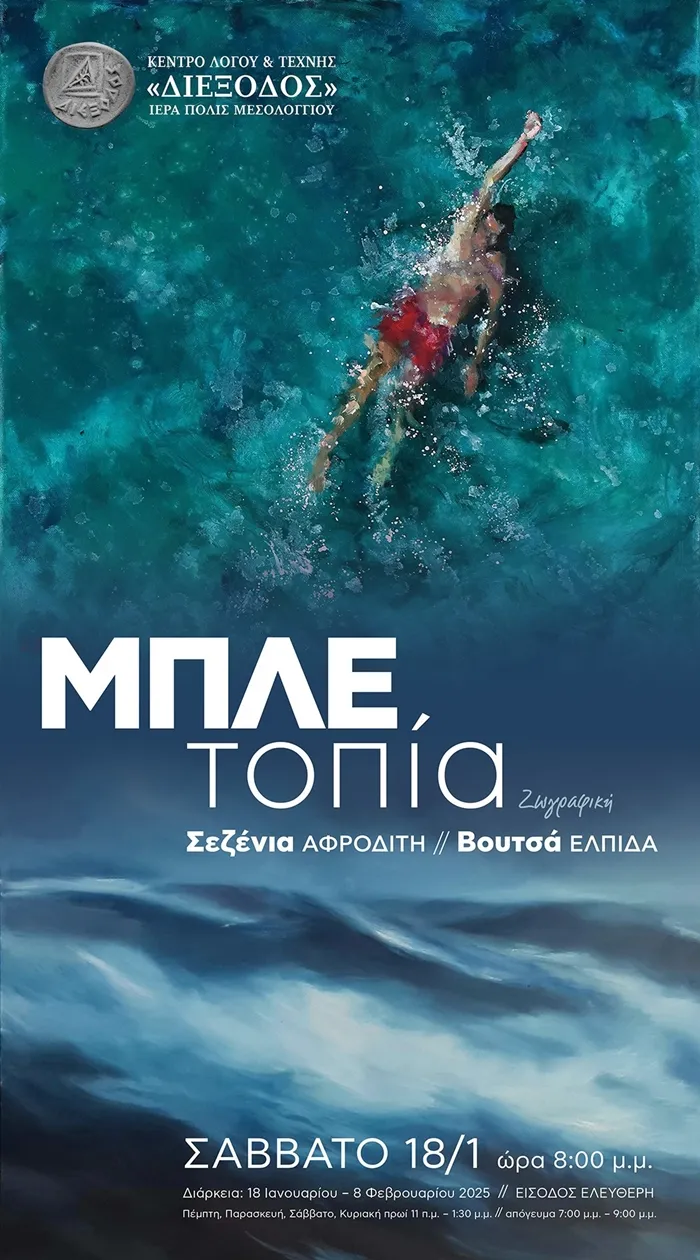 Δύο καταξιωμένες σύγχρονες καλλιτέχνιδες, η Αφροδίτη Σεζένια και η Ελπίδα Βουτσά, εγκαινιάζουν για τον νέο χρόνο τις εικαστικές δραστηριότητες της «Διεξόδου» με μία κοινή τους έκθεση ζωγραφικής που φέρει τον τίτλο «Μπλέ τοπία» αφού σε όλα σχεδόν τα έργα τους κυριαρχεί το χρώμα της θάλασσας και του ορίζοντα.