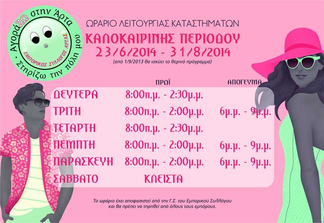 Από την Δευτέρα 23 Ιουνίου ξεκινάει το καλοκαιρινό ωράριο-πενθήμερο των εμπορικών καταστημάτων στην Άρτα και τελειώνει στις 31 Αυγούστου 2014.