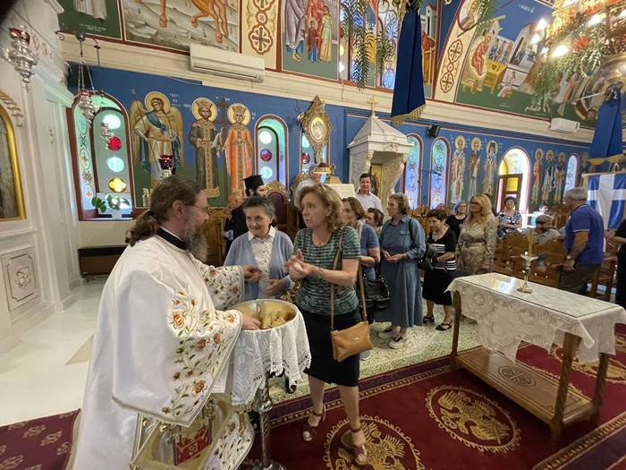 Ευχαρίστησε όλους τους ιερείς που συλλειτούργησαν, τον Πρωτοσύγκελλο της Ιεράς Μητροπόλεως Σάμου π. Σωτήριο, τον Πρωτοσύγκελλο της Ιεράς Μητροπόλεως Λαρίσης π. Ιγνάτιο, τον π. Χριστόδουλο, τον π. Γεώργιο και τον π. Συμεών. Ιδιαιτέρως ευχαρίστησε τον Εφημέριο του Ναού, τον π. Δημήτριο, τον συνεχάρη και τον επήνεσε για το σημαντικό λατρευτικό και ποιμαντικό του έργο και, με την άδεια του οικείου Ποιμενάρχου κ. Ευσεβίου, του απένειμε το οφφίκιο του Οικονόμου.
