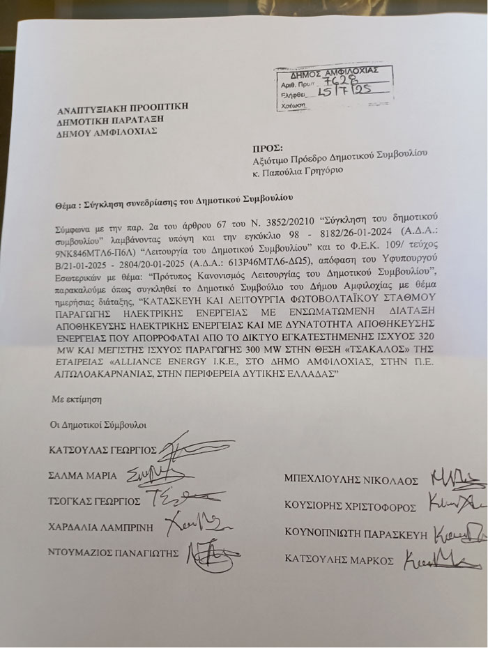 Σύμφωνα με την παρ. 2α του άρθρου 67 του Ν. 3852/20210 “Σύγκληση του δημοτικού συμβουλίου” λαμβάνοντας υπόψη και την εγκύκλιο 98 – 8182/26-01-2024 (Α.Δ.Α.: 9ΝΚ846ΜΤΛ6-Π6Λ) “Λειτουργία του Δημοτικού Συμβουλίου” και το Φ.Ε.Κ. 109/ τεύχος Β/21-01-2025 – 2804/20-01-2025 (Α.Δ.Α.: 613Ρ46ΜΤΛ6-ΔΩ5), απόφαση του Υφυπουργού Εσωτερικών με θέμα: “Πρότυπος Κανονισμός Λειτουργίας του Δημοτικού Συμβουλίου”, παρακαλούμε όπως συγκληθεί το Δημοτικό Συμβούλιο του Δήμου Αμφιλοχίας με θέμα ημερήσιας διάταξης, “ΚΑΤΑΣΚΕΥΗ ΚΑΙ ΛΕΙΤΟΥΡΓΙΑ ΦΩΤΟΒΟΛΤΑΪΚΟΥ ΣΤΑΘΜΟΥ ΠΑΡΑΓΩΓΗΣ ΗΛΕΚΤΡΙΚΗΣ ΕΝΕΡΓΕΙΑΣ ΜΕ ΕΝΣΩΜΑΤΩΜΕΝΗ ΔΙΑΤΑΞΗ ΑΠΟΘΗΚΕΥΣΗΣ ΗΛΕΚΤΡΙΚΗΣ ΕΝΕΡΓΕΙΑΣ ΚΑΙ ΜΕ ΔΥΝΑΤΟΤΗΤΑ ΑΠΟΘΗΚΕΥΣΗΣ ΕΝΕΡΓΕΙΑΣ ΠΟΥ ΑΠΟΡΡΟΦΑΤΑΙ ΑΠΟ ΤΟ ΔΙΚΤΥΟ ΕΓΚΑΤΕΣΤΗΜΕΝΗΣ ΙΣΧΥΟΣ 320 MW KAI ΜΕΓΙΣΤΗΣ ΙΣΧΥΟΣ ΠΑΡΑΓΩΓΗΣ 300 MW ΣΤΗΝ ΘΕΣΗ «ΤΣΑΚΑΛΟΣ» ΤΗΣ ΕΤΑΙΡΕΙΑΣ «ALLIANCE ENERGY Ι.Κ.Ε., ΣΤΟ ΔΗΜΟ ΑΜΦΙΛΟΧΙΑΣ, ΣΤΗΝ Π.Ε. ΑΙΤΩΛΟΑΚΑΡΝΑΝΙΑΣ, ΣΤΗΝ ΠΕΡΙΦΕΡΕΙΑ ΔΥΤΙΚΗΣ ΕΛΛΑΔΑΣ”