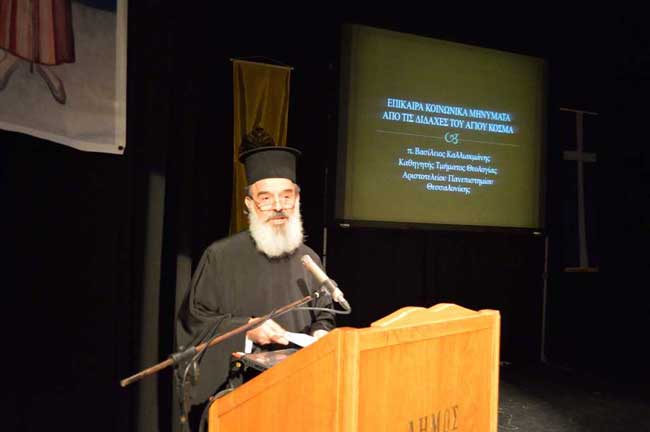 Ακολούθως, στο βήμα προσήλθε, ο αιδεσιμολογιώτατος πρωτοπρεσβύτερος Βασίλειος Καλλιακμάνης, Καθηγητής της Θεολογικής Σχολής του Αριστοτελείου Πανεπιστημίου Θεσσαλονίκης ο οποίος ανέπτυξε το θέμα: «Επίκαιρα κοινωνικά μηνύματα από τις Διδαχές του Αγίου Κοσμά του Αιτωλού»· ανοίγοντας έτσι και επίσημα τις εργασίες της Α’ Συνεδρίας του Επιστημονικού Συνεδρίου, και η οποία ήταν αφιερωμένη στα 300 χρόνια από τη γέννηση του Αγίου Κοσμά του Αιτωλού.