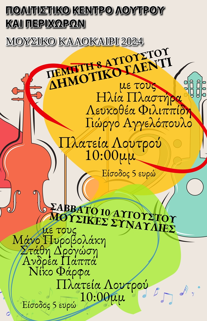 Την Πέμπτη 8 Αυγούστου θα φιλοξενήσουμε στην κεντρική πλατεία Λουτρού την παραδοσιακή ορχήστρα του Ηλία Πλαστήρα σε ένα γνήσιο παραδοσιακό δημοτικό γλέντι. Ένα μεγάλο αντάμωμα των ανθρώπων όλης της περιοχής που αποτελεί πλέον θεσμό. Θα τραγουδήσουν ο Γιώργος Αγγελόπουλος και η Λευκοθέα Φιλιππίδη. Το γλέντι μας θα ξεκινήσει με παρουσίαση παραδοσιακών χορών από το χορευτικό τμήμα του πολιτιστικού μας κέντρου μαζί με το χορευτικό τμήμα των Σαρδηνιων. Η εκδήλωση μας θα ξεκινήσει στις 9.30 μμ.