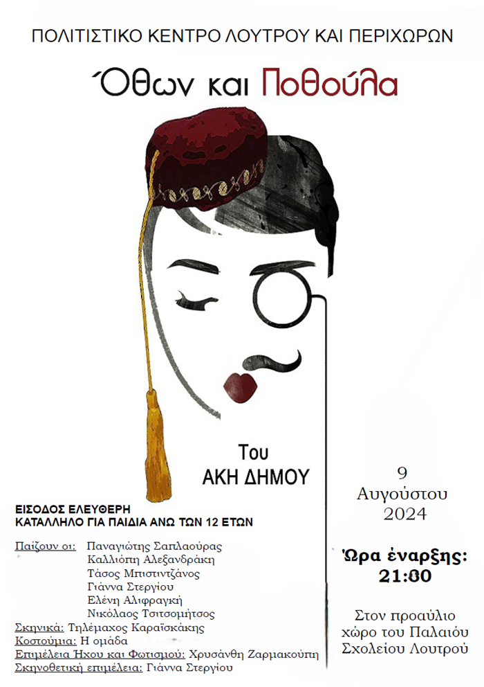 Την Παρασκευή 9 Αυγούστου, στο χώρο του παλιού σχολείου έχουμε τη χαρά να σας παρουσιάσουμε τη θεατρική παράσταση Όθων και Ποθουλα από την ομάδα του πολιτιστικού μας κέντρου. Η θεατρική ομάδα ενηλίκων που πρώτη φορά φέτος παρουσιάζει παράσταση εργάστηκε με ζήλο και ενθουσιασμό και με την επιμέλεια της Γιάννας Στεργίου, θεατρολογου και μέλους του διοικητικού μας συμβουλίου έρχονται να συμπληρώσουν ένα μεγάλο θεατρικό κύκλο επαφής μας με το θέατρο ο οποίος θα ολοκληρωθεί στο τέλος Αυγούστου με την παιδική μας παράσταση “Βάτραχοι” του Αριστοφάνη. Στην αρχή της εκδήλωσης μας θα υπάρξει μικρό αφιέρωμα για τα 40 χρόνια από την ίδρυση του συλλόγου μας Ώρα έναρξης 9.00 μμ
