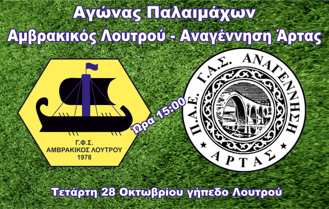 Οι παλαίμαχοι του Αμβρακικού Λουτρού αντιμετωπίζουν την Τετάρτη 28 Οκτωβρίου 2020 στις 15:00 στο Δημοτικό Γήπεδο Λουτρού την αντίστοιχη ομάδα της Αναγέννησης Άρτας. Ένα σπουδαίο φιλικό παιχνίδι με αντιπάλους ποδοσφαιριστές για τους φιλοξενούμενους γνωστά ονόματα του παρελθόντος όπως ο Κασδοβασίλης, Βίτσιος, Υφαντής, Σιακούφης, Σφήκας, κ.α.