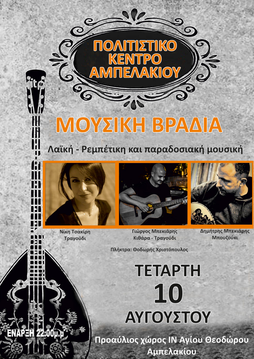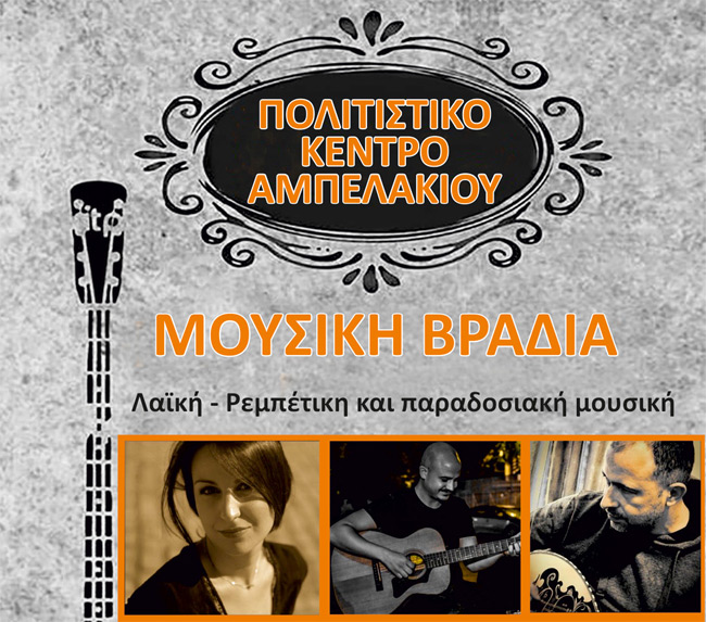 Την πρώτη πολιτιστική μουσική εκδήλωση από την σύσταση του, πραγματοποιεί το Πολιτιστικό Κέντρο Αμπελακίου σήμερα Τετάρτη 10 Αυγούστου 2022 στο προαύλιο του Ιερού Ναού Αγίου Θεοδώρου. Η προσέλευση αναμένεται να είναι μεγάλη καθώς έχουν περάσει 25 χρόνια από την τελευταία εκδήλωση του τότε Πολιτιστικού Συλλόγου, επίσης η επιθυμία των χωριανών που αγκάλιασε την πρωτοβουλία ανασύστασης με ιδιαίτερη ζέση, είναι πρόδηλα ενθουσιώδης για την αποψινή βραδιά.
