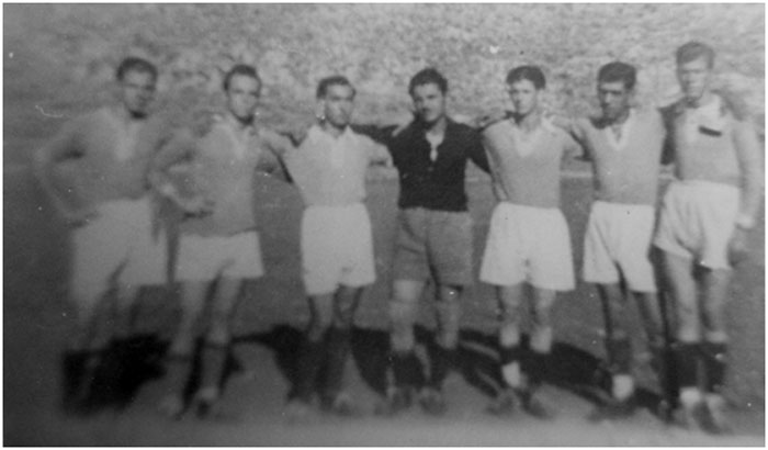 ΟΛΥΜΠΙΑΚΟΣ 1947 Ιωάννης Παπαιωάννου,Στέλιος Δημάδης, Ιωάννης Ζερβοπάνος, Δημήτριος Κατσάνος, Λάκης Θεοδώρου, Αλέκος Σβέτσας και ο Νίκος Πανέτας.