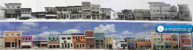 Από πάνω απεικονίζεται η σημερινή άποψη της πόλης και κάτω η πρόταση χρωματισμού των κτηρίων για την οδό Θ. Χαβίνη