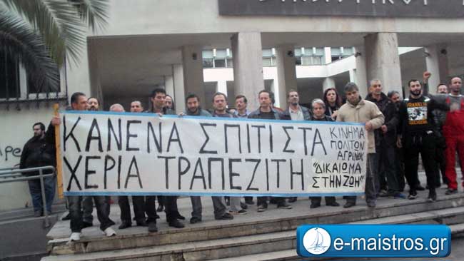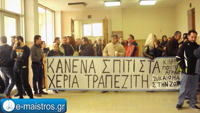 Δυναμικά κινήθηκαν τα μέλη και οι φίλοι του κινήματος «Δικαίωμα στη ζωή», την Τετάρτη 3 Δεκεμβρίου, στο ειρηνοδικείο Αγρινίου και κατάφεραν να ματαιώσουν τον προγραμματισμένο πλειστηριασμό ακίνητης περιουσίας για χρέη σε τράπεζα, κατοίκου της ευρύτερης περιοχής του Αγρινίου, ο οποίος δεν είχε τη δυνατότητα να αποπληρώσει τα χρέη του λόγω της παρατεταμένης και σκληρής οικονομικής κρίσης. Ο ορισμένος από το νόμο γνωστός συμβολαιογράφος του Αγρινίου εμφανίστηκε στις 15:30 μ.μ., στην αίθουσα των δικαστηρίων, παρουσία ισχυρής αστυνομικής δύναμης. Του ζητήθηκε να αποχωρήσει ειρηνικά από το χώρο κι εκείνος απομακρύνθηκε μέσω δυνατών αποδοκιμασιών και επιφωνημάτων. Οι παρευρισκόμενοι παρέμειναν εκεί μέχρι τις 5:00 το απόγευμα. Παρόν στον αγώνα ήταν και ο γνωστός σε όλους για τη μαχητικότητά του και τη ζωντάνια του, ο παπα-Ηλίας Υφαντής, που χαρακτηριστικά είπε ότι «είμαστε όλοι υποψήφιοι, σαν άτομα, σαν οικογένειες, να υποστούμε όλοι τα ίδια μέτρα, γι΄αυτό βρισκόμαστε εδώ για να βοηθήσουμε τους συμπολίτες μας». Συντεταγμένοι στην ομάδα κρούσης ήταν και κάτοικοι της Αμφιλοχίας που συμμετείχαν μαζικά στη συγκεκριμένη δράση.Να θυμίσουμε ότι την προηγούμενη Τετάρτη απετράπη επιτυχώς ο πλειστηριασμός ακίνητης περιουσίας στο ειρηνοδικείο Αμφιλοχίας.