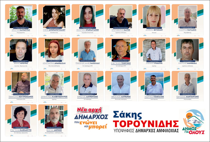 Στην εκπνοή της προθεσμίας κατάθεσης ψηφοδελτίων εντείνεται η ανακοίνωση υποψήφιων Δημοτικών και Τοπικών Συμβούλων. Ο επικεφαλής του συνδυασμού «Δήμος για Όλους» ανακοίνωσε ακόμη 20 υποψήφιους. Έμπειρα αλλά και νέα στελέχη, με όρεξη για δουλειά συντάσσονται στο πλευρό του υποψήφιου Δημάρχου Αμφιλοχίας Σάκη Τορουνίδη.