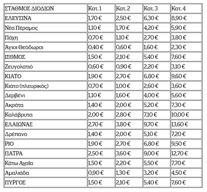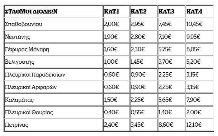 Οι νέες τιμές ανά σταθμό και κατηγορία οχήματος διαμορφώνονται ως εξής (Με κεφαλαία οι μετωπικοί σταθμοί διοδίων):