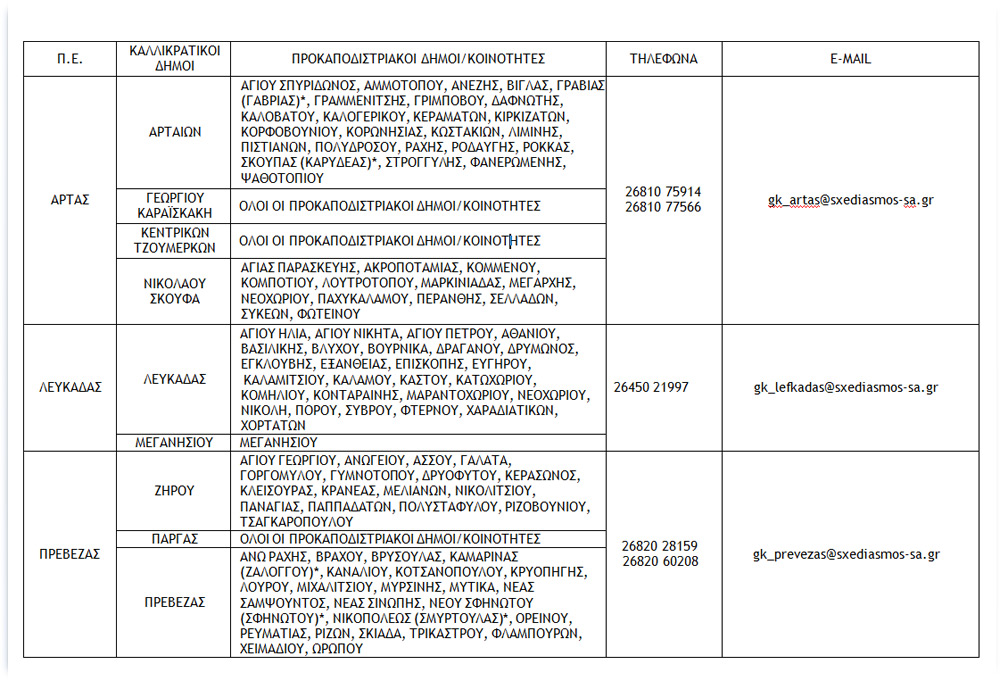 Ακολουθεί λεπτομερής πίνακας με τις περιοχές και τα στοιχεία επικοινωνίας.