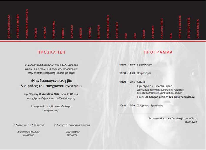 empesosΟι Σύλλογοι Διδασκόντων Γυμνασίου-Γενικού Λυκείου Εμπεσού διοργανώνουν ανοικτή εκδήλωση-ομιλία με θέμα: «Η ενδοοικογενειακή βία και ο ρόλος του σύγχρονου σχολείου», την Πέμπτη 10 Απριλίου 2014 και ώρα 11:00 στο χώρο του σχολείου με ομιλήτρια την Δ/ντρια του Παιδοψυχιατρικού Τμήματος του Καραμανδάνειου Νοσοκομείου Πατρών, κα Βιολέτα Σιγάλα.