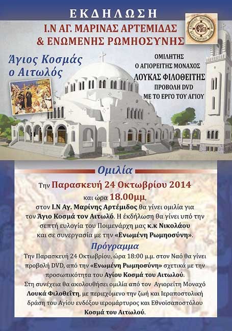 Την Παρασκευή 24 Οκτωβρίου 2014 και ώρα 18.00μμ, στον Ι.Ν Αγίας Μαρίνης Αρτέμιδος θα γίνει ομιλία για τον Άγιο Κοσμά τον Αιτωλό. Η εκδήλωση θα γίνει υπό τη σεπτή ευλογία του Ποιμενάρχη μας κ.κ Νικολάου και σε συνεργασία με την «Ενωμένη Ρωμηοσύνη».