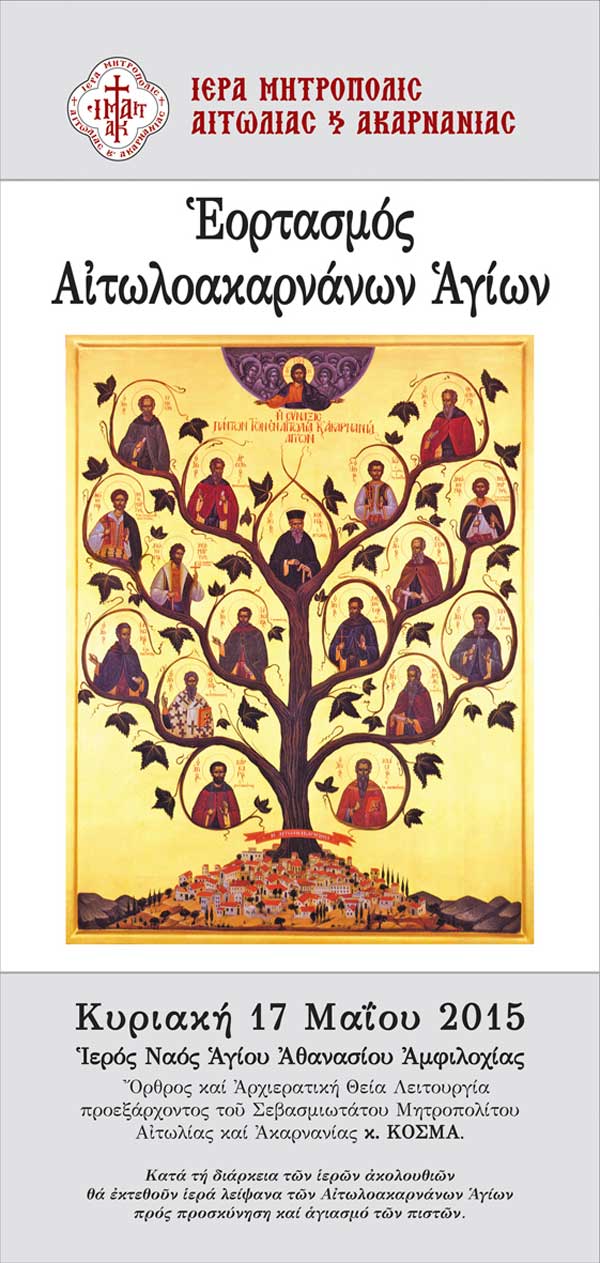 Η Ιερά Μητρόπολις Αιτωλίας και Ακαρνανίας ιδιαιτέρως τιμά κάθε χρόνο τους Οσίους και Αγίους που καθαγίασαν με τους ασκητικούς αγώνες, τα δάκρυά τους και το μαρτυρικό τους αίμα, την γη της Αιτωλοακαρνανίας. Δεκαέξι συνολικά Άγιοι, με κορυφαίο τον ισαπόστολο και ιερομάρτυρα Κοσμά τον Αιτωλό, του οποίου μάλιστα το προηγούμενο έτος εορτάσαμε τα τριακόσια χρόνια από την γέννησή του, έζησαν, πέρασαν ή μαρτύρησαν στην περιφέρεια της Αιτωλοακαρνανίας.