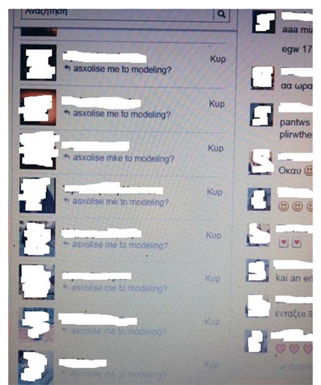 Χαρακτηριστική είναι, επίσης, η περίπτωση του 33χρονου ημεδαπού, ο οποίος μετά από έλεγχο των διαδικτυακών συνομιλιών, προέκυψε ότι υποδυόταν τον εργαζόμενο σε πρακτορείο μοντέλων και προέτρεπε τα ανήλικα θύματα του στην ανταλλαγή παιδικού πορνογραφικού υλικού, με το πρόσχημα της αποστολής του παραπάνω υλικού σε πρακτορείο μοντέλων στην Αργεντινή, έναντι υψηλής αμοιβής.
