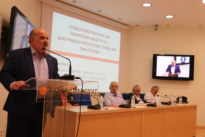 Ο Πρόεδρος της Γ.Σ.Ε.Β.Ε.Ε. Γιώργος Καββαθάς, μίλησε για τον σημαίνοντα ρόλο του πρωτογενή τομέα για την οικονομία, με τον Παναγιώτη Τσιχριτζή, Πρόεδρο του Επιμελητηρίου Αιτωλοακαρνανίας να αναφέρεται στα αγροτικά τμήματα και στα προγράμματα που υποστηρίζουν τα αγροδιατροφικά προϊόντα.