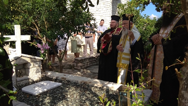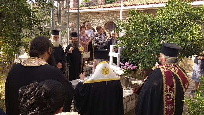 Μετά την απόλυση της Θείας Λειτουργίας ο Σεβασμιώτατος τέλεσε τρισάγιο στον τάφο του μακαριστού κτίτορος του Ιερού Ησυχαστηρίου αρχιμ. Θεοκλήτου Ντζάθα, που βρίσκεται πίσω από το ιερό Βήμα.