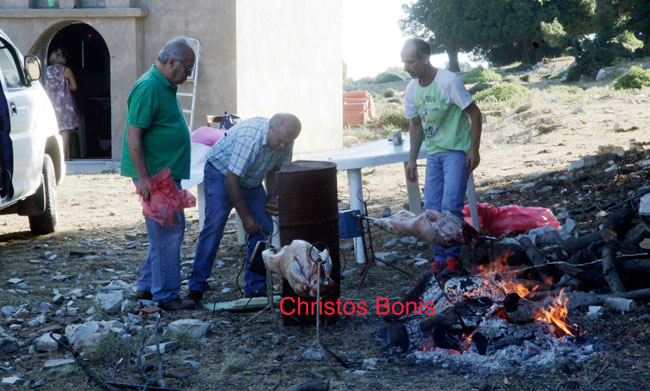 Η επιστροφή τους ήταν καλοδεχούμενη με τσίπουρο διότι μας φόρτωσαν από ένα μάτσο μυρωδάτη ρίγανη!!!! Οι υπόλοιποι άνδρες ανέλαβαν το στήσιμο το σούβλισμα και το άναμμα της φωτιάς όπου σε λίγα λεπτά θα τοποθετούσαν δυο σφαχτά μαζί με το απαραίτητο κοκορέτσι, οι δε γυναίκες ,οι οποίες πριν από ώρα είχαν στρώσει τα τραπέζια , ασχολούνταν με τις υπόλοιπες απαραίτητες καθ’ όλα εργασίες προετοιμασίας του τραπεζιού για το επερχομενο φαγοπότι…(σαλάτες τυριά κρύα ποτήρια ), έπαιρναν θέση.