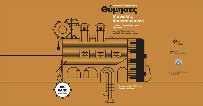 Το Πολιτιστικό Ίδρυμα Ομίλου Πειραιώς, σε συνεργασία με τον Δήμο Ιωαννιτών, την Εφορεία Αρχαιοτήτων Ιωαννίνων και την JazzSolidarity Network, οργανώνει τη μουσική παράσταση «Θύμησες», του Μανώλη Κουτσουνάνου, την Τετάρτη 27 Αυγούστου 2025 (ώρα 21:00), στο Μουσείο Αργυροτεχνίας, στα Ιωάννινα.