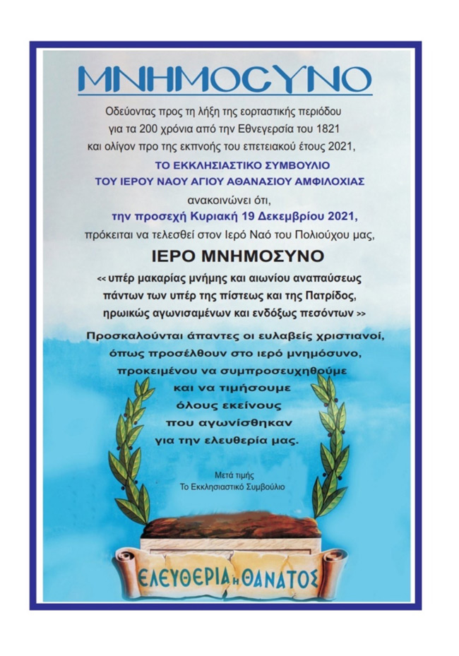 Ιερό μνημόσυνο αύριο στον Άγιο Αθανάσιο στη μνήμη των ηρώων που έπεσαν για την πατρίδα