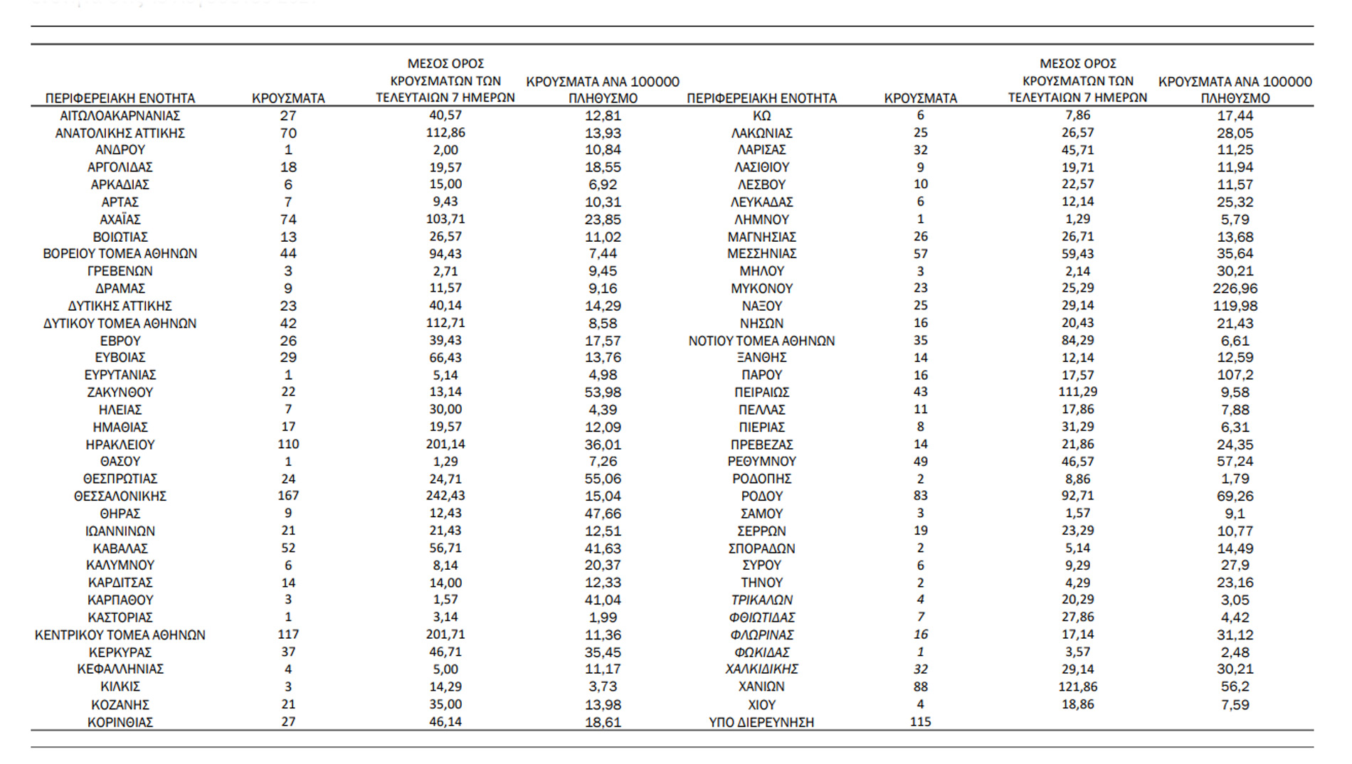 Ο συνολικός αριθμός των κρουσμάτων ανέρχεται σε 537.125 (ημερήσια μεταβολή +0.4%), εκ των οποίων 51.2% άνδρες. Με βάση τα επιβεβαιωμένα κρούσματα των τελευταίων 7 ημερών, 134 θεωρούνται σχετιζόμενα με ταξίδι από το εξωτερικό και 2.082 είναι σχετιζόμενα με ήδη γνωστό κρούσμα.