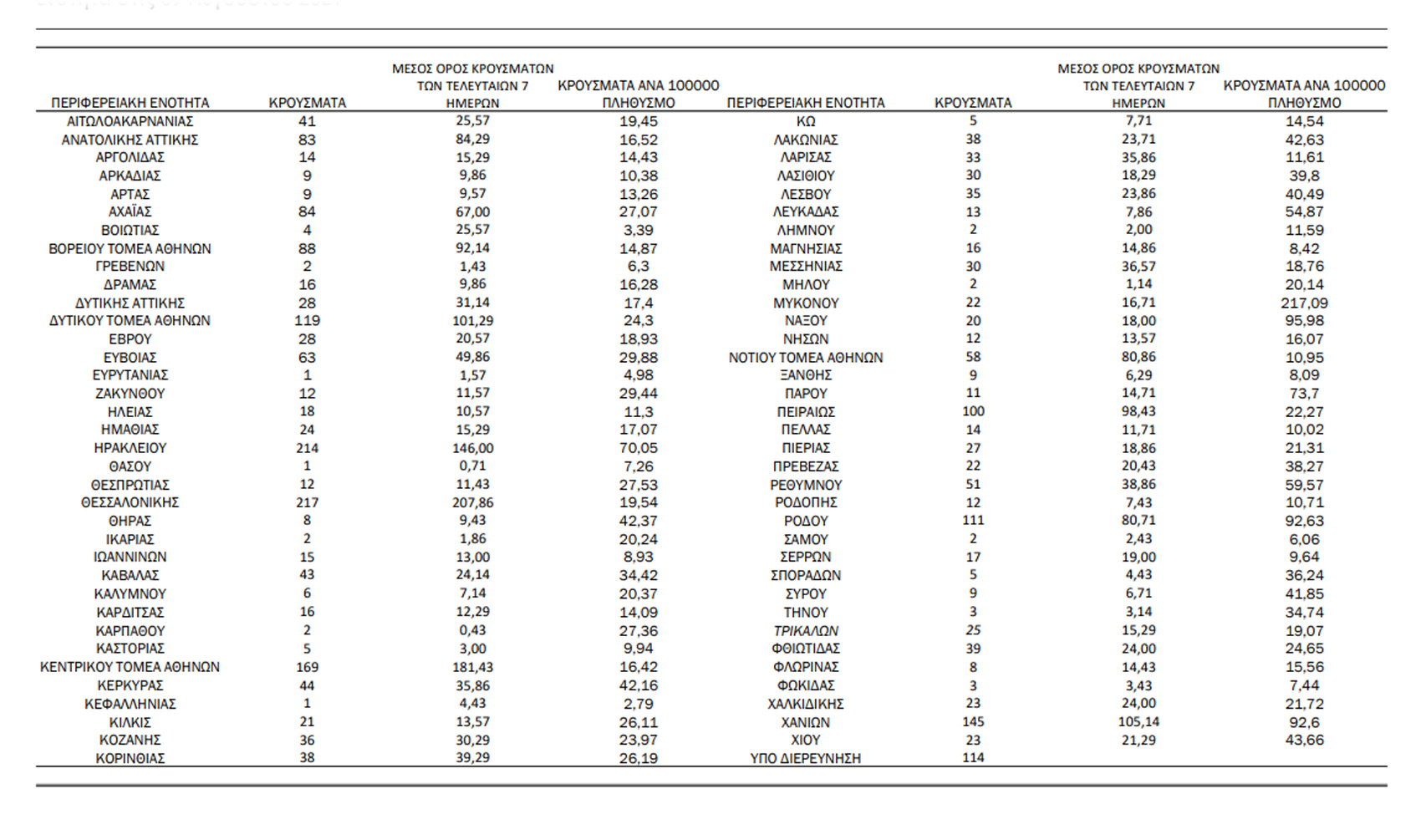 Ο συνολικός αριθμός των κρουσμάτων ανέρχεται σε 516.785 (ημερήσια μεταβολή +0.5%), εκ των οποίων 51.2% άνδρες. 1 Με βάση τα επιβεβαιωμένα κρούσματα των τελευταίων 7 ημερών, 116 θεωρούνται σχετιζόμενα με ταξίδι από το εξωτερικό και 2.389 είναι σχετιζόμενα με ήδη γνωστό κρούσμα.