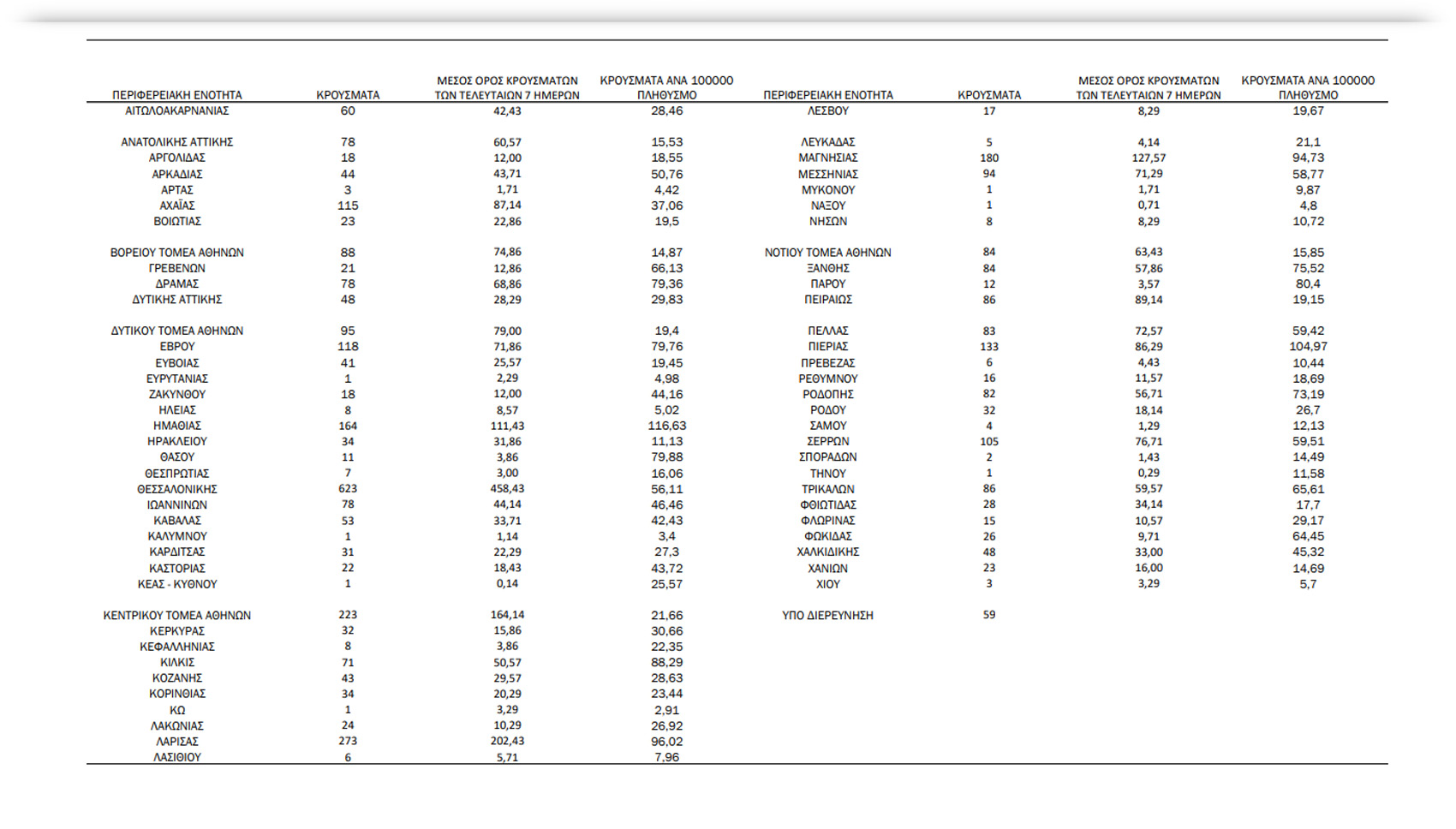 Ο συνολικός αριθμός των κρουσμάτων ανέρχεται σε 720.295(ημερήσια μεταβολή +0.5%), εκ των οποίων 50.8% άνδρες. Με βάση τα επιβεβαιωμένα κρούσματα των τελευταίων 7 ημερών, 139θεωρούνται σχετιζόμενα με ταξίδι από το εξωτερικό και 3.050 είναι σχετιζόμενα με ήδη γνωστό κρούσμα.