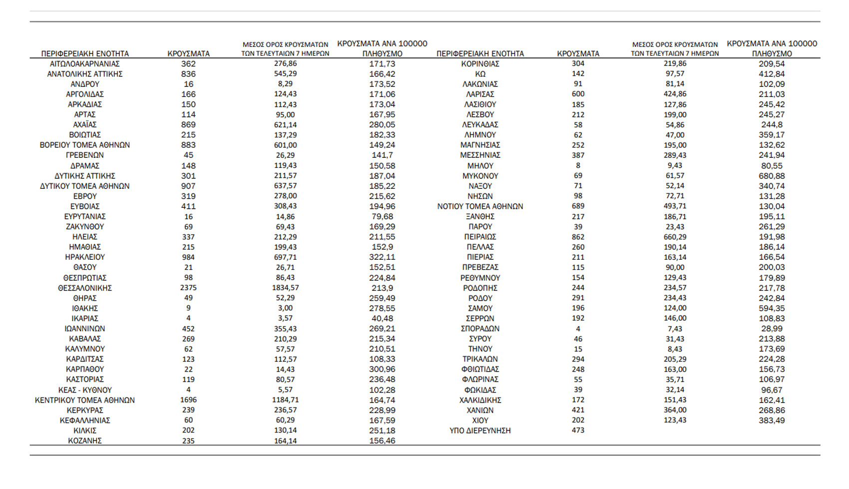 Τα νέα εργαστηριακά επιβεβαιωμένα κρούσματα της νόσου που καταγράφηκαν τις τελευταίες 24 ώρες είναι 21.412, εκ των οποίων 32 εντοπίστηκαν κατόπιν ελέγχων στις πύλες εισόδου της χώρας. Ο συνολικός αριθμός των κρουσμάτων ανέρχεται σε 2.216.411 (ημερήσια μεταβολή +1.0%), εκ των οποίων 49.7% άνδρες. Με βάση τα επιβεβαιωμένα κρούσματα των τελευταίων 7 ημερών, 395 θεωρούνται σχετιζόμενα με ταξίδι από το εξωτερικό και 2.338 είναι σχετιζόμενα με ήδη γνωστό κρούσμα.