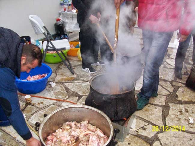 Η κάθε οικογένεια μόνη της ή μαζί με τις γειτονικές, άναβε μια μεγάλη φωτιά στην αυλή της και τοποθετούσε την πυροστιά, το καζάνι, το χοιρινό και φυσικά το μεράκι της. Μυρωδιές τσιγαριαστού κρέατος διαχέονταν στην ατμόσφαιρα και μαζί με το πνεύμα των γιορτών που διακατείχε τους ανθρώπους έδιναν μια διαφορετική νότα στα χωριά.