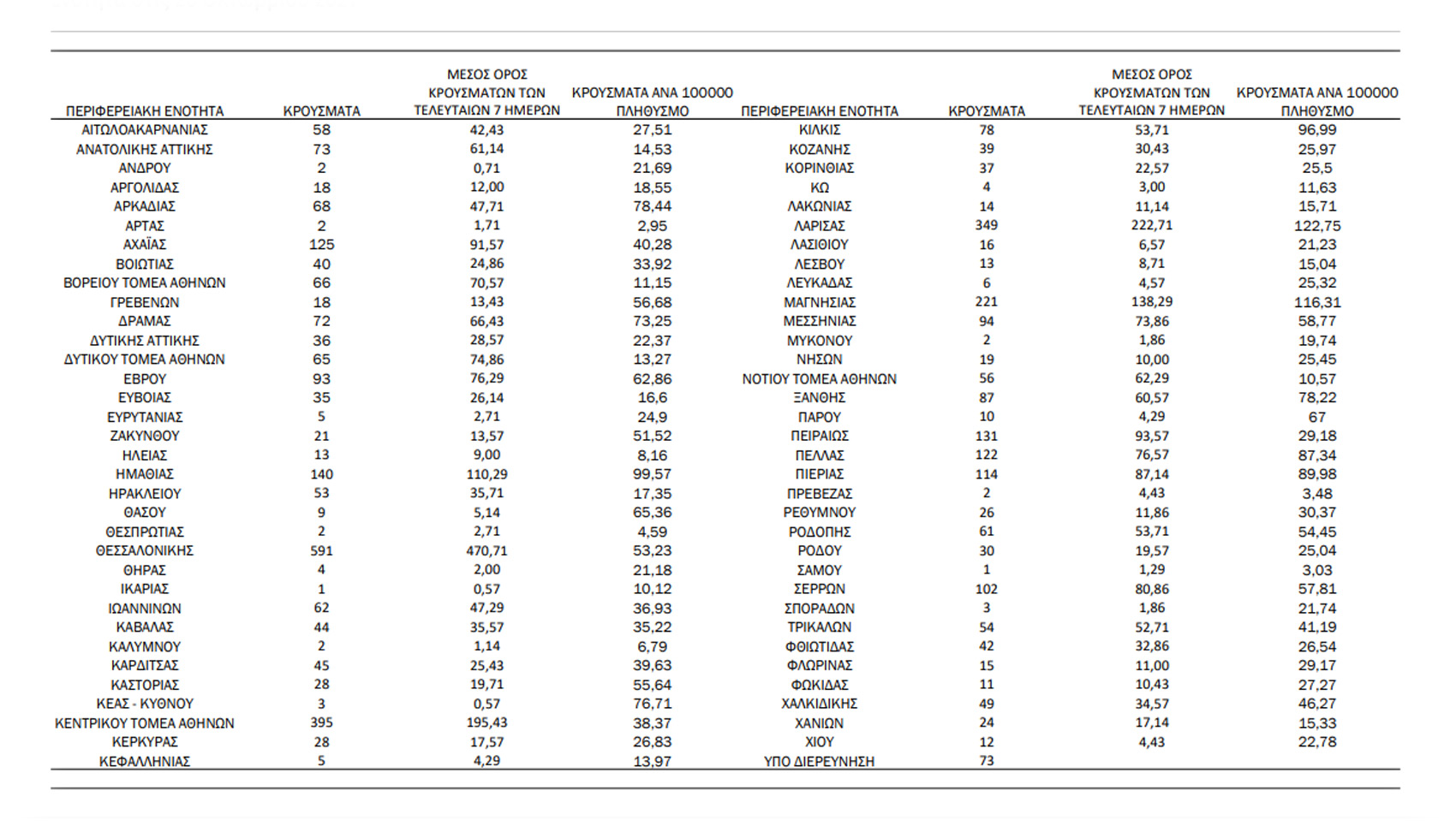 Τα νέα εργαστηριακά επιβεβαιωμένα κρούσματα της νόσου που καταγράφηκαν τις τελευταίες 24 ώρες είναι 4.165, εκ των οποίων 7 εντοπίστηκαν κατόπιν ελέγχων στις πύλες εισόδου της χώρας. Ο συνολικός αριθμός των κρουσμάτων ανέρχεται σε 724.571 (ημερήσια μεταβολή +0.6%), εκ των οποίων 50.8% άνδρες. Με βάση τα επιβεβαιωμένα κρούσματα των τελευταίων 7 ημερών, 144 θεωρούνται σχετιζόμενα με ταξίδι από το εξωτερικό και 2.876 είναι σχετιζόμενα με ήδη γνωστό κρούσμα.