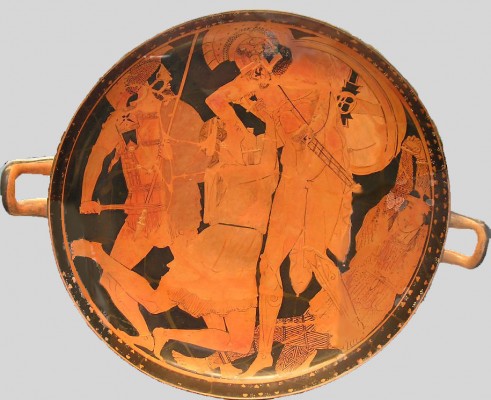 Ο Αχιλλέας σκοτώνει την Πενθεσίλεια. Η κύλικα αποδίδεται σ’ έναν άγνωστο ζωγράφο που πήρε τ’ όνομά του απ” τη σύνθεση αυτή και τον ονομάζουμε συμβατικά ζωγράφο της Πενθεσίλειας. Χρονολογείται στο 455 π.Χ και βρίσκεται στο Μόναχο…