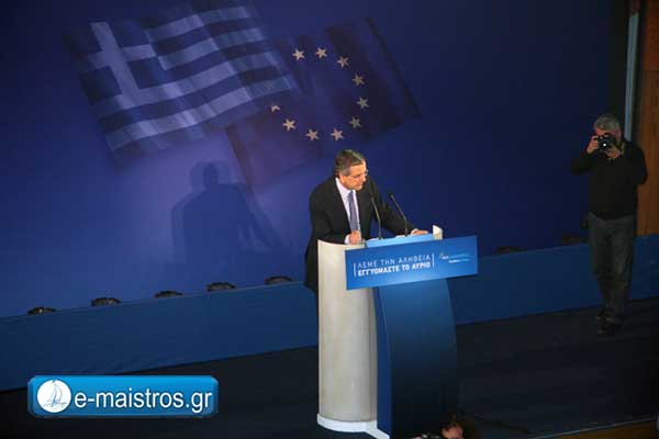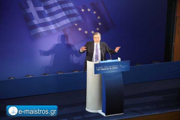 Διλήμματα, που αφορούν τόσο την πορεία της μετεκλογικής Ελλάδας όσο και το πρόσωπο του κυβερνήτη και συνεπώς, και της κυβέρνησης που θα ηγηθεί αυτής της προσπάθειας, έθεσε από το Αγρίνιο ο πρωθυπουργός στην τελική ευθεία πριν από τις κάλπες. «Είμαστε πολύ κοντά στο καλύτερο, αλλά είμαστε και πολύ κοντά στο χειρότερο. Είμαστε πολύ κοντά στην οριστική απογείωση, αλλά και πολύ κοντά στο να βουλιάξουμε ξανά. Πολύ κοντά στο ευρωπαϊκό μέλλον που μας αξίζει, αλλά και πολύ κοντά στην εθνική απομόνωση και στην οικονομική καταστροφή και την έλλειψη ρευστότητας που θα μας πάει δεκαετίες πίσω», διαμήνυσε ο κ. Σαμαράς, που χθες μίλησε σε συγκέντρωση στο Αγρίνιο, καλώντας τους πολίτες να αποφασίσουν ποια από τις δύο φωτογραφίες της Ελλάδας θέλουν την επομένη των εκλογών.