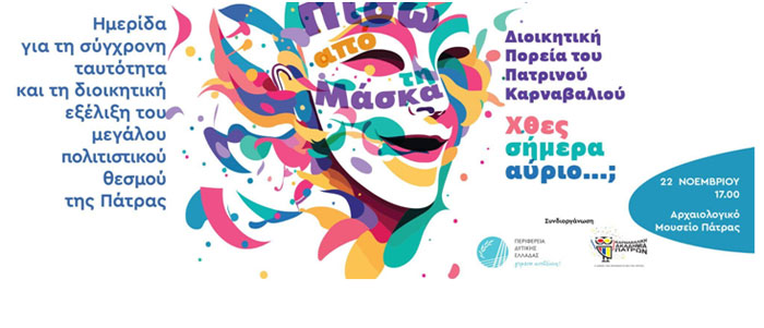 Η Καρναβαλική Ακαδημία Πάτρας, αφουγκραζόμενη την ανάγκη αναστοχασμού και επαναπροσδιορισμού των λειτουργιών του θεσμού, διοργανώνει την ημερίδα με τίτλο: «Πίσω από τη Μάσκα: Η Διοικητική Πορεία του Πατρινού Καρναβαλιού. Χθες – Σήμερα – Αύριο;», με τη συνδιοργάνωση της Περιφέρειας Δυτικής Ελλάδας. Η ημερίδα θα πραγματοποιηθεί στο Αμφιθέατρο του Αρχαιολογικού Μουσείου Πάτρας, το Σάββατο 22 Νοεμβριου και ώρα 17.00 – 21.00.
