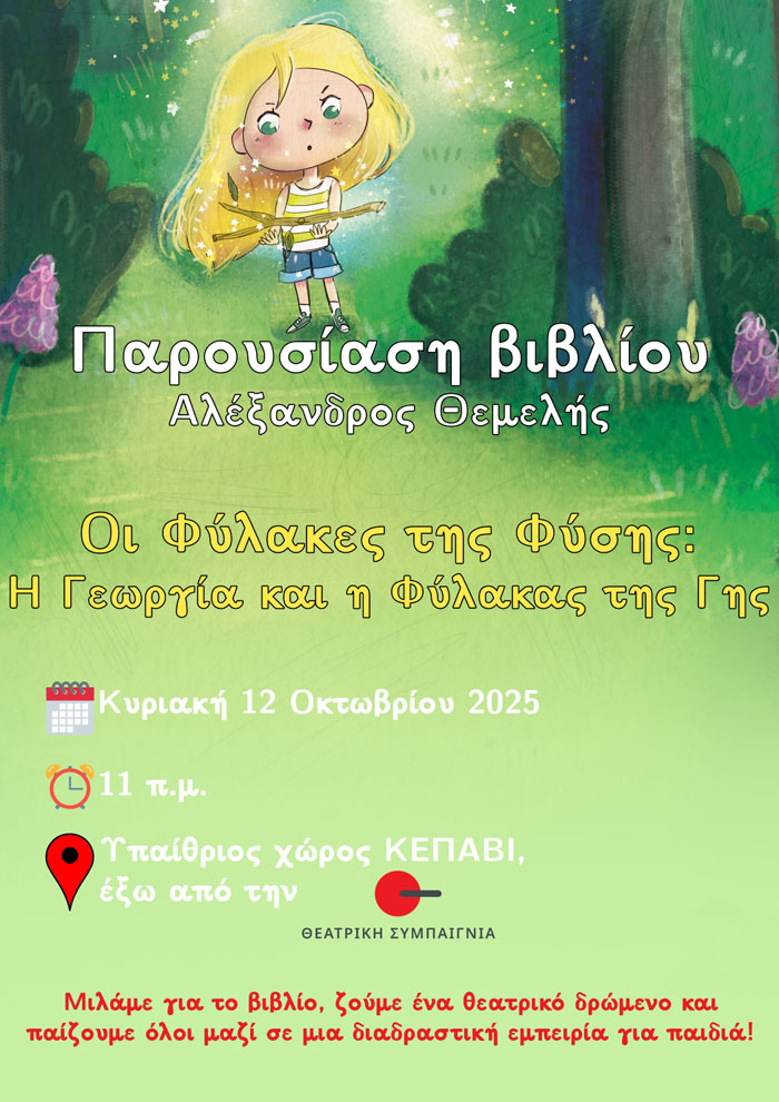 Οι Εκδόσεις Ελκυστής και ο συγγραφέας Αλέξανδρος Θεμελής προσκαλούν μικρούς και μεγάλους στην παρουσίαση του παιδικού βιβλίου «Οι Φύλακες της Φύσης: Η Γεωργία και η Φύλακας της Γης», την Κυριακή 12 Οκτωβρίου, στις 11:00 π.μ., στον υπαίθριο χώρο του ΚΕΠΑΒΙ (έξω από τη Θεατρική Συμπαιγνία).