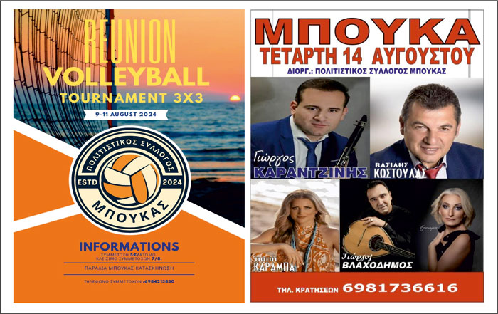 Από τις 9 έως τις 11 Αυγούστου, οι αθλητικές καρδιές θα χτυπούν δυνατά στην παραλία της Μπούκας, όπου θα πραγματοποιηθεί το τουρνουά Beach Volley 3×3. Αθλητές από την ευρύτερη περιοχή, αλλά και επισκέπτες, θα έχουν την ευκαιρία να απολαύσουν τον ήλιο, την άμμο και τον συναγωνισμό σε ένα φιλικό και διασκεδαστικό περιβάλλον. Το τουρνουά αυτό αποτελεί μια ευκαιρία για την προώθηση του αθλητισμού και την ανάδειξη της φυσικής ομορφιάς της περιοχής.