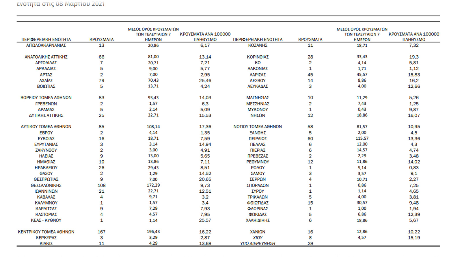 Τα στοιχεία που παρουσιάζονται αφορούν περιστατικά από την επιδημιολογική επιτήρηση της νόσου από το νέο κορωνοϊό (COVID19), με βάση τα δεδομένα που έχουν δηλωθεί στον ΕΟΔΥ και καταγραφεί μέχρι τις 08 Μαρτίου 2021 (ώρα 15:00).