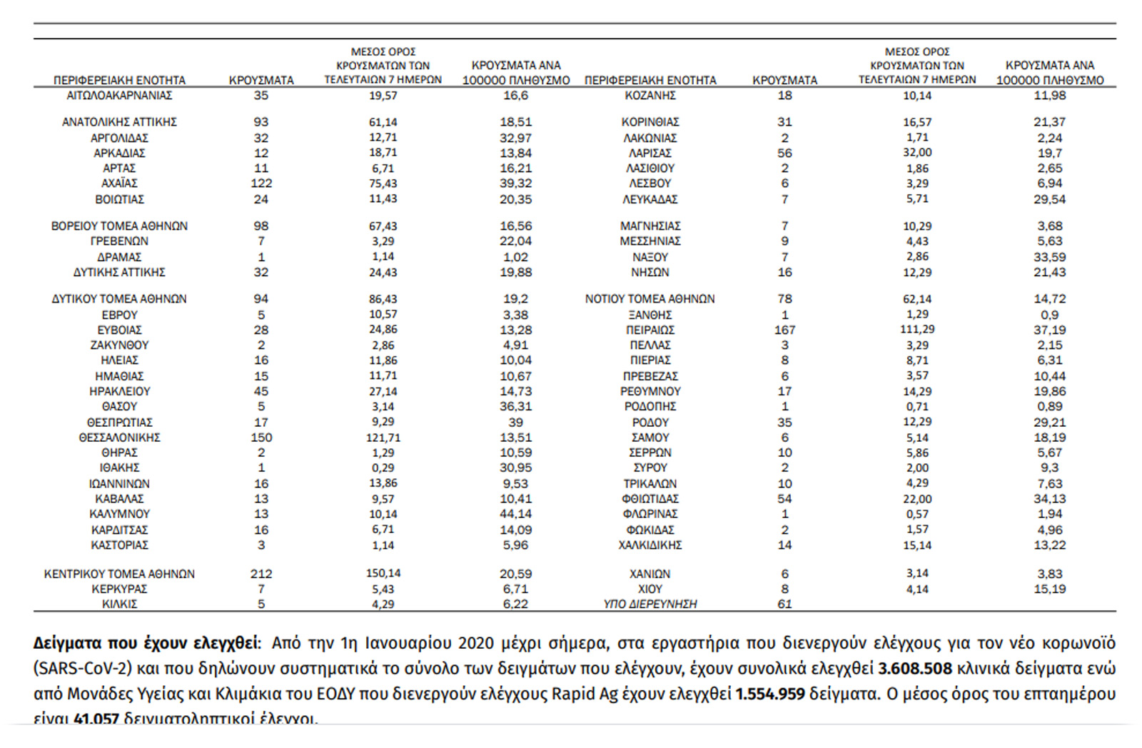 1 Με βάση τα επιβεβαιωμένα κρούσματα των τελευταίων 7 ημερών, 62 θεωρούνται σχετιζόμενα με ταξίδι από το εξωτερικό και 2.462 είναι σχετιζόμενα με ήδη γνωστό κρούσμα.
