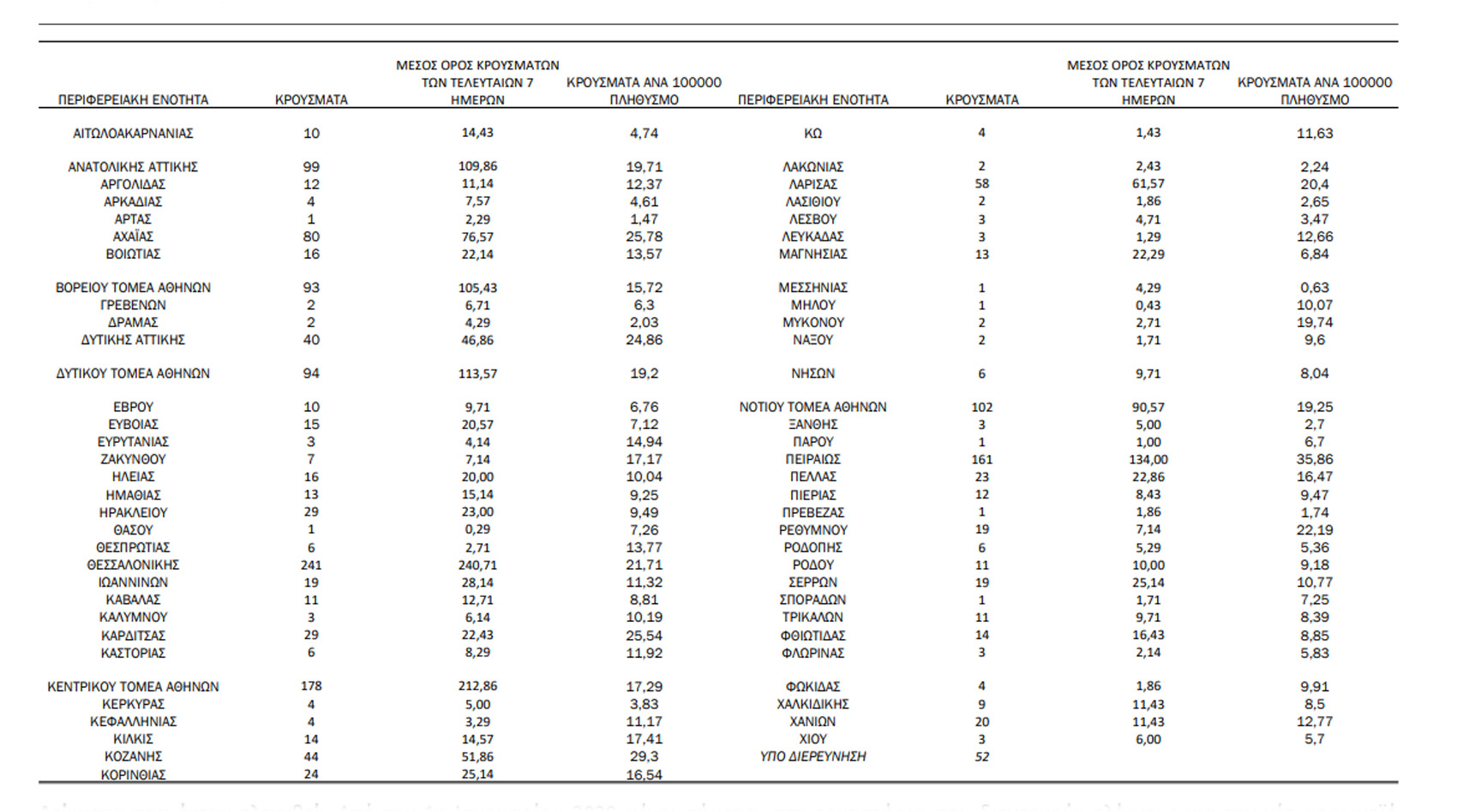Τα νέα εργαστηριακά επιβεβαιωμένα κρούσματα της νόσου που καταγράφηκαν τις τελευταίες 24 ώρες είναι 1.724, εκ των οποίων 22 εντοπίστηκαν κατόπιν ελέγχων στις πύλες εισόδου της χώρας. Ο συνολικός αριθμός των κρουσμάτων ανέρχεται σε 255.755 (ημερήσια μεταβολή +0.7%), εκ των οποίων 51.5% άνδρες. Με βάση τα επιβεβαιωμένα κρούσματα των τελευταίων 7 ημερών, 72 θεωρούνται σχετιζόμενα με ταξίδι από το εξωτερικό και 2.162 είναι σχετιζόμενα με ήδη γνωστό κρούσμα.