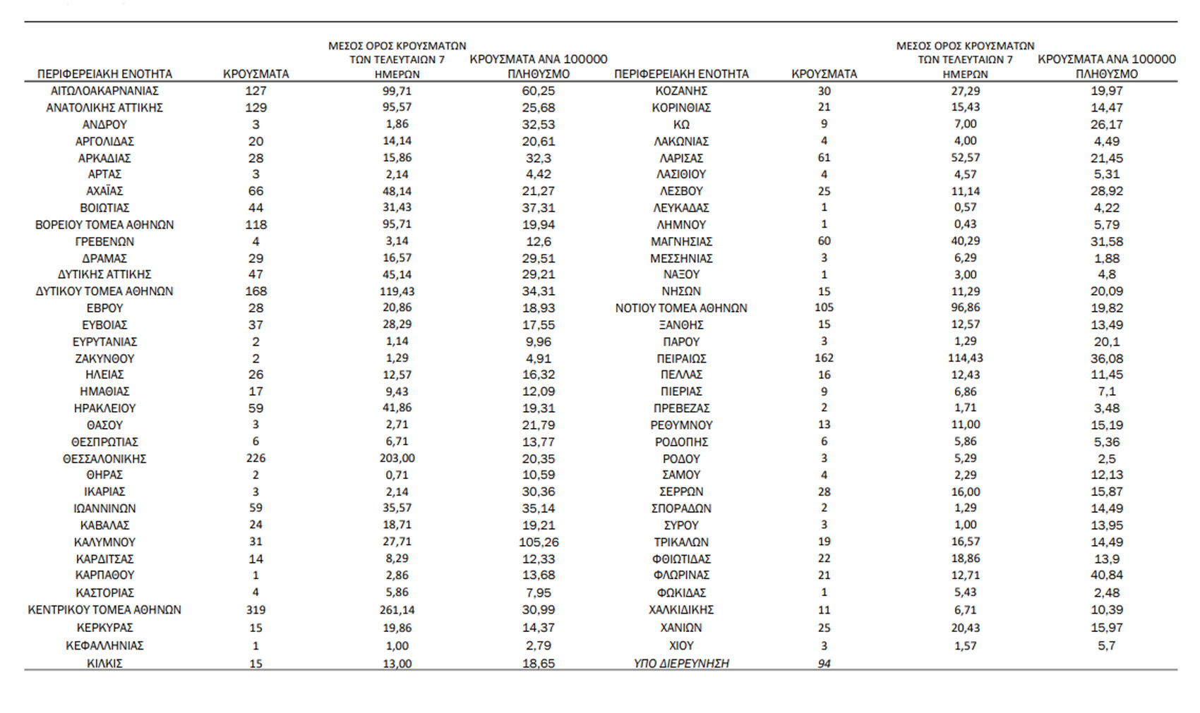 Τριψήφιος ήταν επίσης ο αριθμός στην Αιτωλοακαρνανία (127), ενώ υψηλά νούμερα καταγράφηκαν σε Αχαΐα (66), Ηράκλειο (59), Λάρισα (61) και Μαγνησία (60).