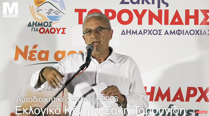 Μια ευρεία και καθαρή νίκη πέτυχε στην εκλογική αναμέτρηση της 8ης Οκτωβρίου ο Σάκης Τορουνίδης. Με ανεπίσημο ποσοστό κοντά στο 57% και 15 από τις 25 έδρες δημιουργεί ένα πανίσχυρο δημοτικό συμβούλιο για να κυβερνήσει το Δήμο Αμφιλοχίας την επόμενη πενταετία.