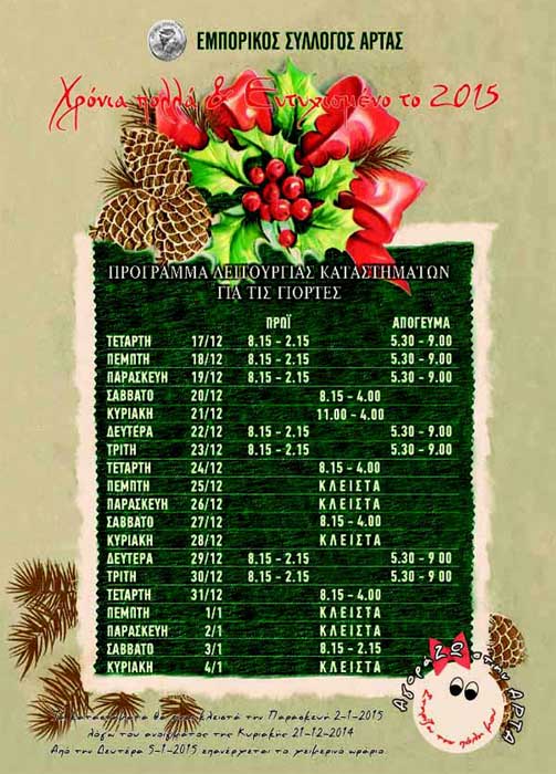Σε ισχύ είναι από την Τετάρτη το εορταστικό ωράριο των καταστημάτων της Άρτας και τα καταστήματα θα είναι ανοιχτά τις Κυριακές 14 και 21 Δεκεμβρίου, ενώ κλειστά θα είναι την την Κυριακή 28 Δεκεμβρίο.