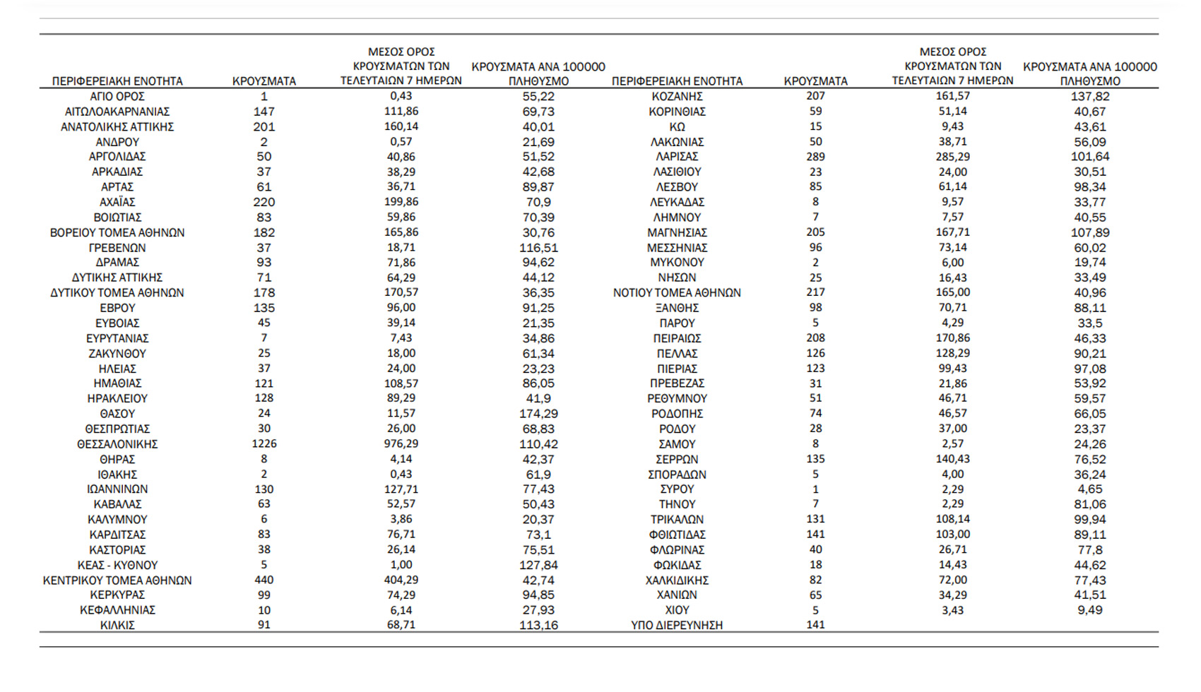 Τα νέα εργαστηριακά επιβεβαιωμένα κρούσματα της νόσου που καταγράφηκαν τις τελευταίες 24 ώρες είναι 6.950, εκ των οποίων 15 εντοπίστηκαν κατόπιν ελέγχων στις πύλες εισόδου της χώρας. Ο συνολικός αριθμός των κρουσμάτων ανέρχεται σε 838.824 (ημερήσια μεταβολή +0.8%), εκ των οποίων 50.7% άνδρες. Με βάση τα επιβεβαιωμένα κρούσματα των τελευταίων 7 ημερών, 105 θεωρούνται σχετιζόμενα με ταξίδι από το εξωτερικό και 2.727 είναι σχετιζόμενα με ήδη γνωστό κρούσμα.
