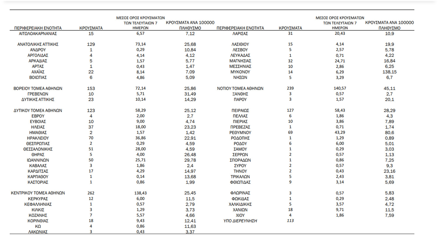 Τα νέα εργαστηριακά επιβεβαιωμένα κρούσματα της νόσου που καταγράφηκαν τις τελευταίες 24 ώρες είναι 1.820, εκ των οποίων 6 εντοπίστηκαν κατόπιν ελέγχων στις πύλες εισόδου της χώρας. Ο συνολικός αριθμός των κρουσμάτων ανέρχεται σε 430.960 (ημερήσια μεταβολή +0.4%), εκ των οποίων 51.2% άνδρες. Με βάση τα επιβεβαιωμένα κρούσματα των τελευταίων 7 ημερών, 147 θεωρούνται σχετιζόμενα με ταξίδι από το εξωτερικό και 1.636 είναι σχετιζόμενα με ήδη γνωστό κρούσμα.