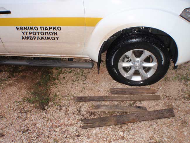 Την Πέμπτη 4 Δεκεμβρίου 2014 το απόγευμα και ενώ το υπηρεσιακό αυτοκίνητο του Φορέα Διαχείρισης Υγροτόπων Αμβρακικού εκτελούσε προγραμματισμένη περιπολία στη λουρονησίδα της λιμνοθάλασσας Λογαρού «περιοχή Αετός», έπεσε πάνω σε σανίδες με καρφιά, οι οποίες δεν ήταν ορατές καθώς ήταν τοποθετημένες μέσα σε λακκούβες με νερό. Τα μπροστινά λάστιχα του αυτοκινήτου καταστράφηκαν και αυτό είχε ως συνέπεια το αυτοκίνητο προσωρινά να ακινητοποιηθεί. Αξίζει να σημειωθεί ότι στην ίδια περιοχή την προηγούμενη ημέρα, δηλ την Τετάρτη 3 Δεκεμβρίου, και σύμφωνα με το φύλλο καταγραφών των φυλάκων του Φορέα, διαπιστώθηκαν τουλάχιστον δύο περιστατικά λαθροθηρίας με χρήση βάρκας και μάλιστα οι επιβαίνοντες εξύβρισαν χυδαία τους φύλακες-επόπτες του Φορέα. Επειδή παρόμοια περιστατικά έχουν συμβεί και άλλες φορές στο παρελθόν, παύουν να είναι απλές συμπτώσεις και πρόκειται για εσκεμμένες ενέργειες κάποιων που για τους δικούς τους «γνωστούς» λόγους ενοχλούνται και αντιδρούν.