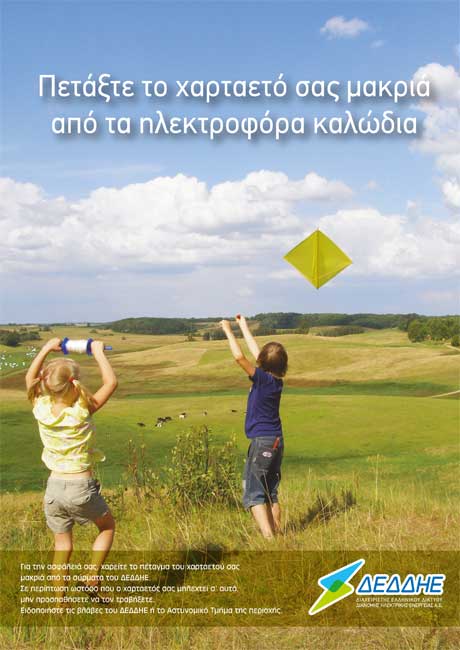Ο Διαχειριστής Ελληνικού Δικτύου Διανομής Ηλεκτρικής Ενέργειας (ΔΕΔΔΗΕ) σας συμβουλεύει να μην πετάτε το χαρταετό σας κοντά σε ηλεκτροφόρα καλώδια, καθώς υπάρχει σοβαρός κίνδυνος ηλεκτροπληξίας για εσάς και διακοπή της παροχής ρεύματος στη γύρω περιοχή.