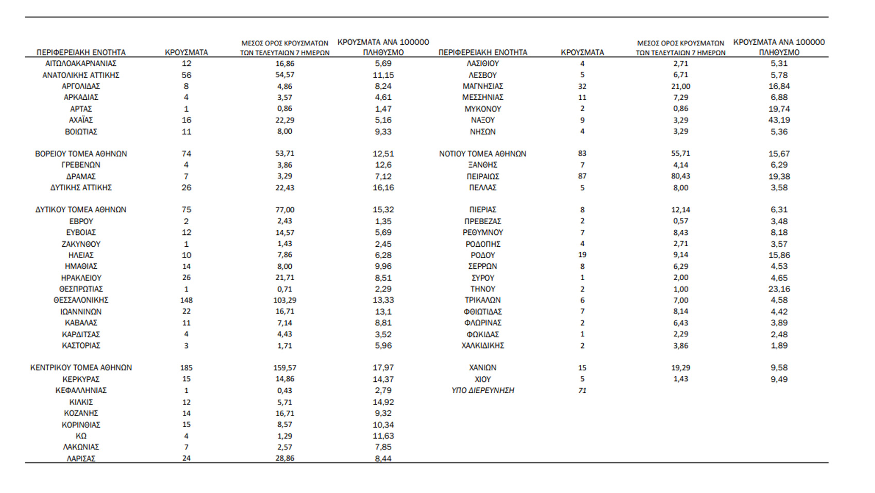 1 Με βάση τα επιβεβαιωμένα κρούσματα των τελευταίων 7 ημερών,33 θεωρούνται σχετιζόμενα με ταξίδι από το εξωτερικό και 1.779 είναι σχετιζόμενα με ήδη γνωστό κρούσμα.