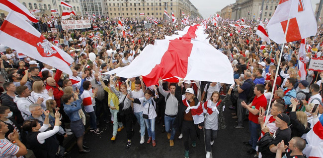 Κρατώντας κοκκινόλευκες σημαίες, τα χρώματα της αμφισβήτησης, πολίτες συγκεντρώθηκαν στην πλατεία της Ανεξαρτησίας Δεκάδες χιλιάδες Λευκορώσοι διαδηλώνουν σήμερα στο Μινσκ για να καταγγείλουν την επανεκλογή του...