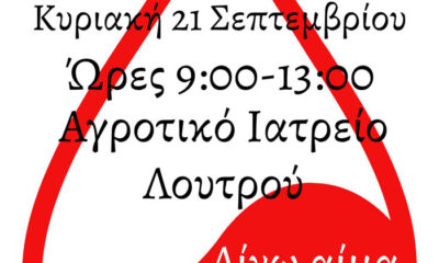Την Κυριακή 21 Σεπτεμβρίου από τις 9.00 έως 13.00 στο Αγροτικό ιατρείο Λουτρού θα γίνει τακτική εθελοντική που διοργανώνει το Πολιτιστικό Κέντρο Λουτρού και περιχώρων με...