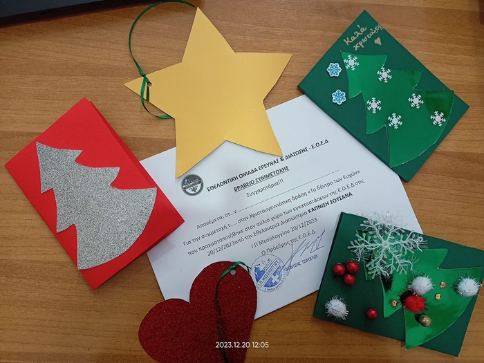 Ευχαριστούμε την διεύθυνση των Δημοτικών Σχολείων 1ου και 4ου για την συμμετοχή τους,το μέλος της ΕΟΕΔ Σουσάνα Καπνίση η οποία είχε και την επιμέλεια της Χριστουγεννιάτικης Δράσης,και φυσικά τα μέλη της ΕΟΕΔ που παρευρέθηκαν και βοήθησαν στην υλοποίηση της!!
